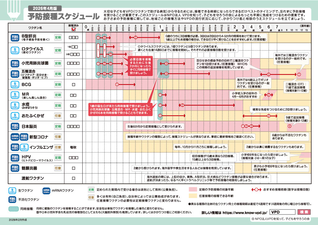 当院でワクチンスケジュールを作成しておりますので、気軽にお申し付けください。